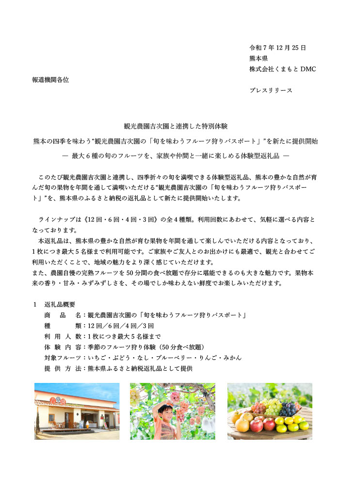 このたび観光農園吉次園と連携し、四季折々の旬を満喫できる体験型返礼品、熊本の豊かな自然が育んだ旬の果物を年間を通して満喫いただける“観光農園吉次園の「旬を味わうフルーツ狩りパスポート」”を、熊本県のふるさと納税の返礼品として新たに提供開始いたします。詳細につきましては、以下資料等をご覧ください。